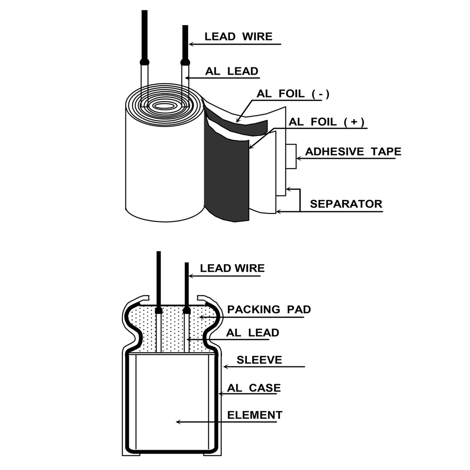- Dielectric material: aluminum electrolytic. Lead description: long lead = positive "+"; short lead = negative "-".