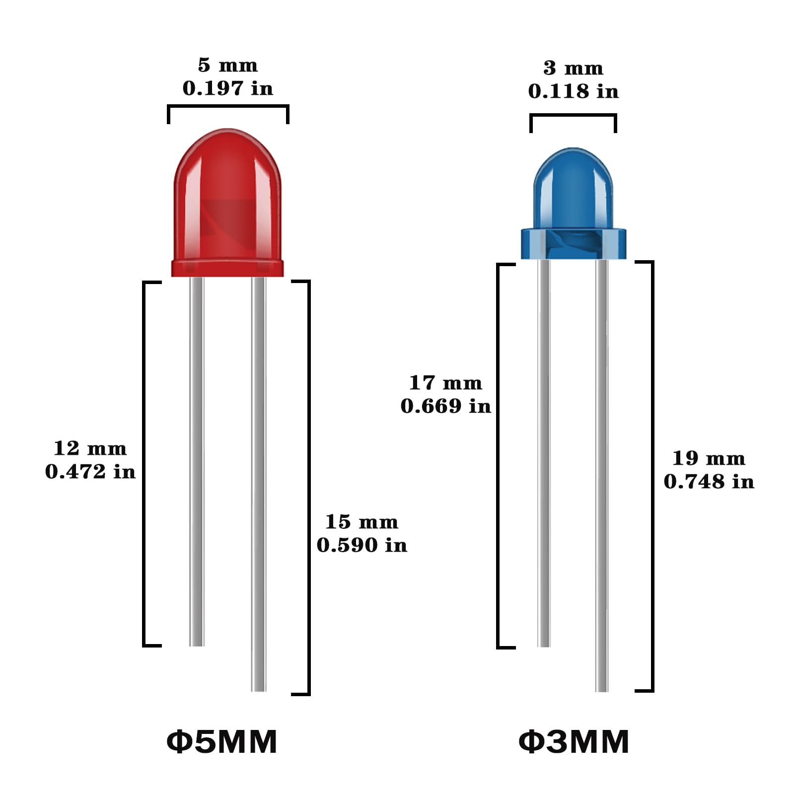 - Head diameter: 3mm & 5mm. Long Pin: 19MM / Anode / "+". Short Pin: 18MM / Cathode / "-".
