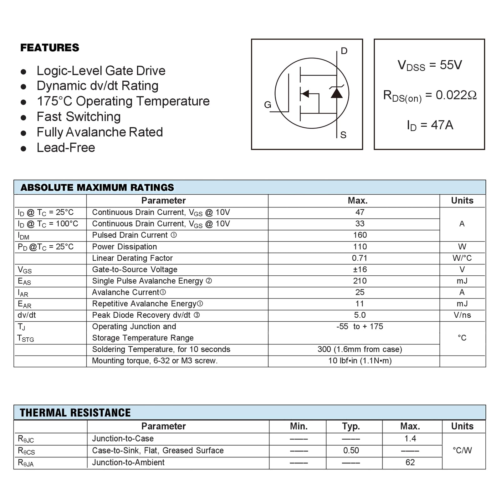 - Rated Voltage: 55V ; Rated Current: 47A ; Dissipation Power: 110W.