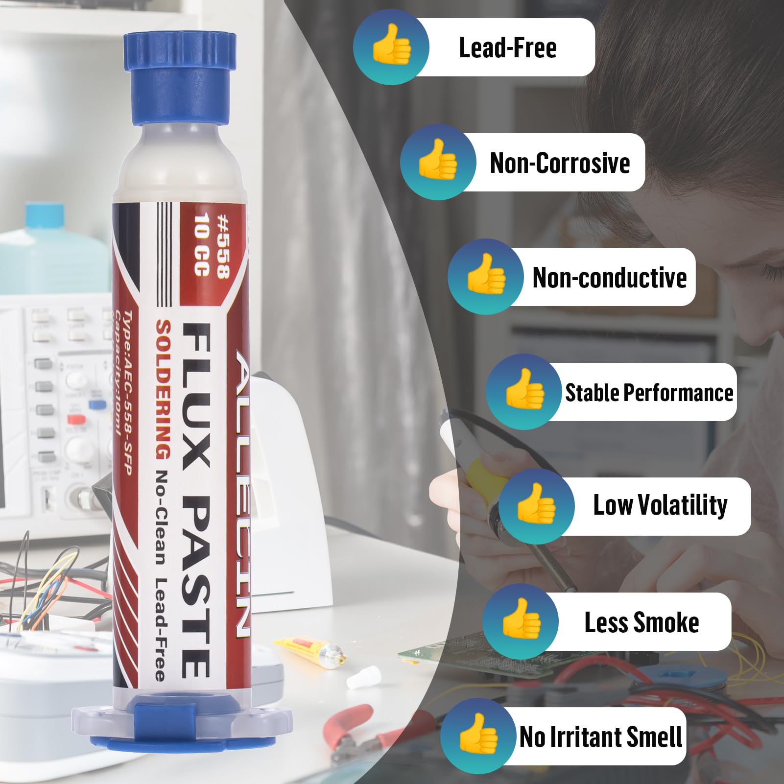 - Features & Advantages: Lead-Free, Non-Corrosive, Non-conductive, Moisture-proof, Stable Performance, Low Volatility, No Shelf Life, Less Smoke, No Irritant Smell.
