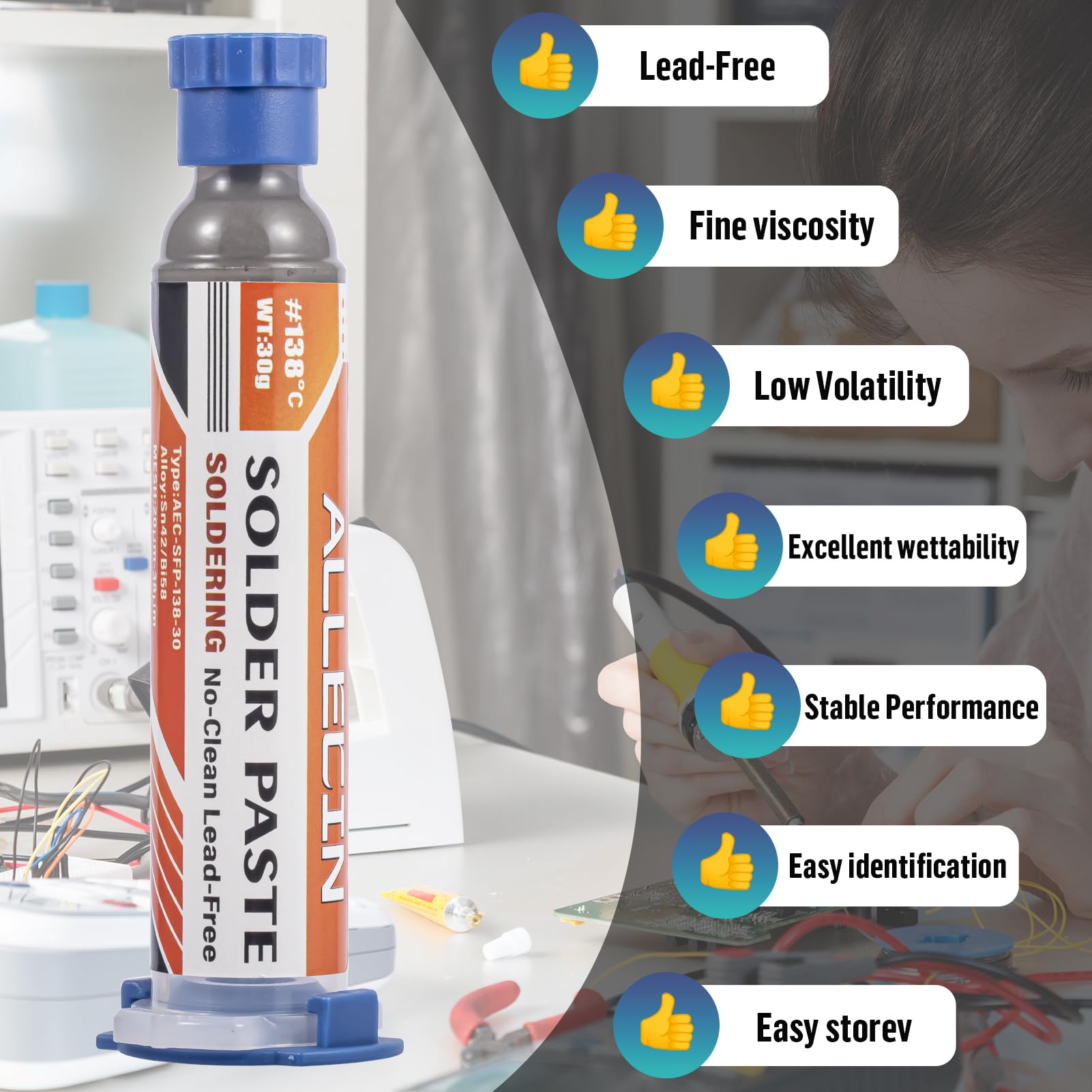- ALLECIN Sn42/Bi58 30g Lead Free Solder Paste 138℃ -- For solder repair work on a variety of electronic equipment.