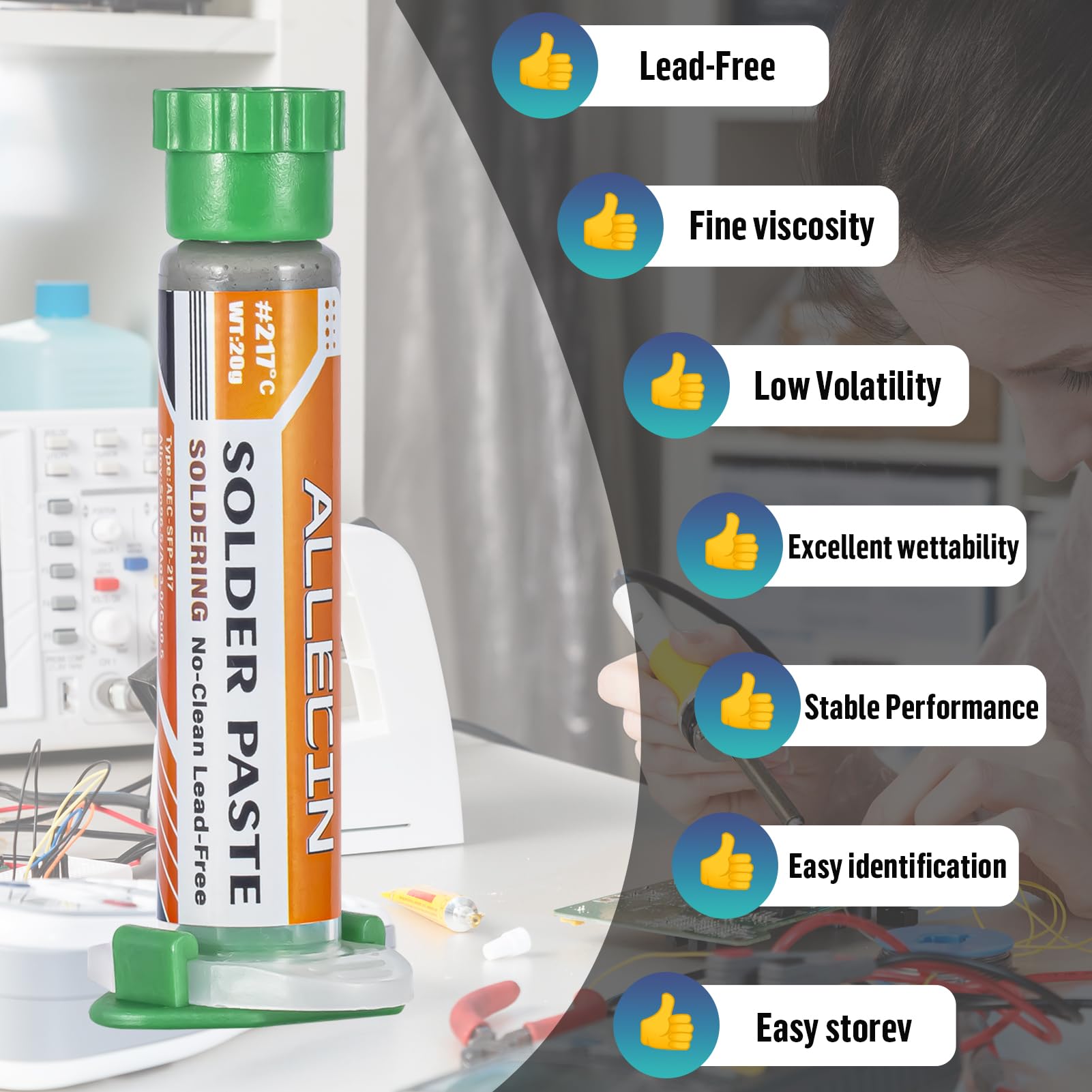 - ALLECIN Sn96.5/Ag3/Cu0.5 20g Lead Free Solder Paste 217℃ -- For solder repair work on a variety of electronic equipment.